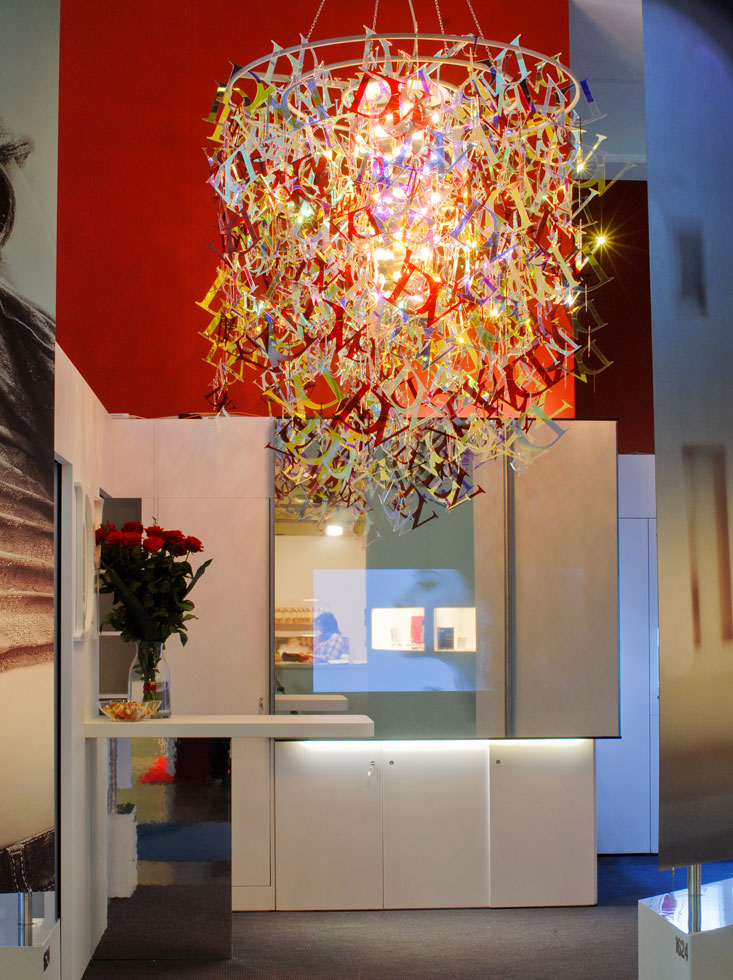 Un lampadario ottenuto duplicando il logo di Daveri in infinite variazioni di colore tramite l’utilizzo dell’effetto cangiante, per un luccichio attraente come i gioielli presentati dal brand.